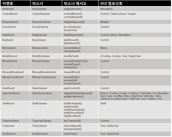 이벤트라 함은 버튼클릭, 텍스트 내용이 변경된경우 등등의 해당되며, 이와 SWT에서 이벤트