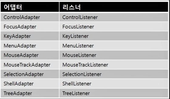 즉 익명의 인터페이스를 사용하지 않고 또한 모든메소드를 구현하지 않기 위해 어댑터라 부르는 특별한 클래스로 사용하여 구현 :: 내부 메소드를 필요한것만 사용가능