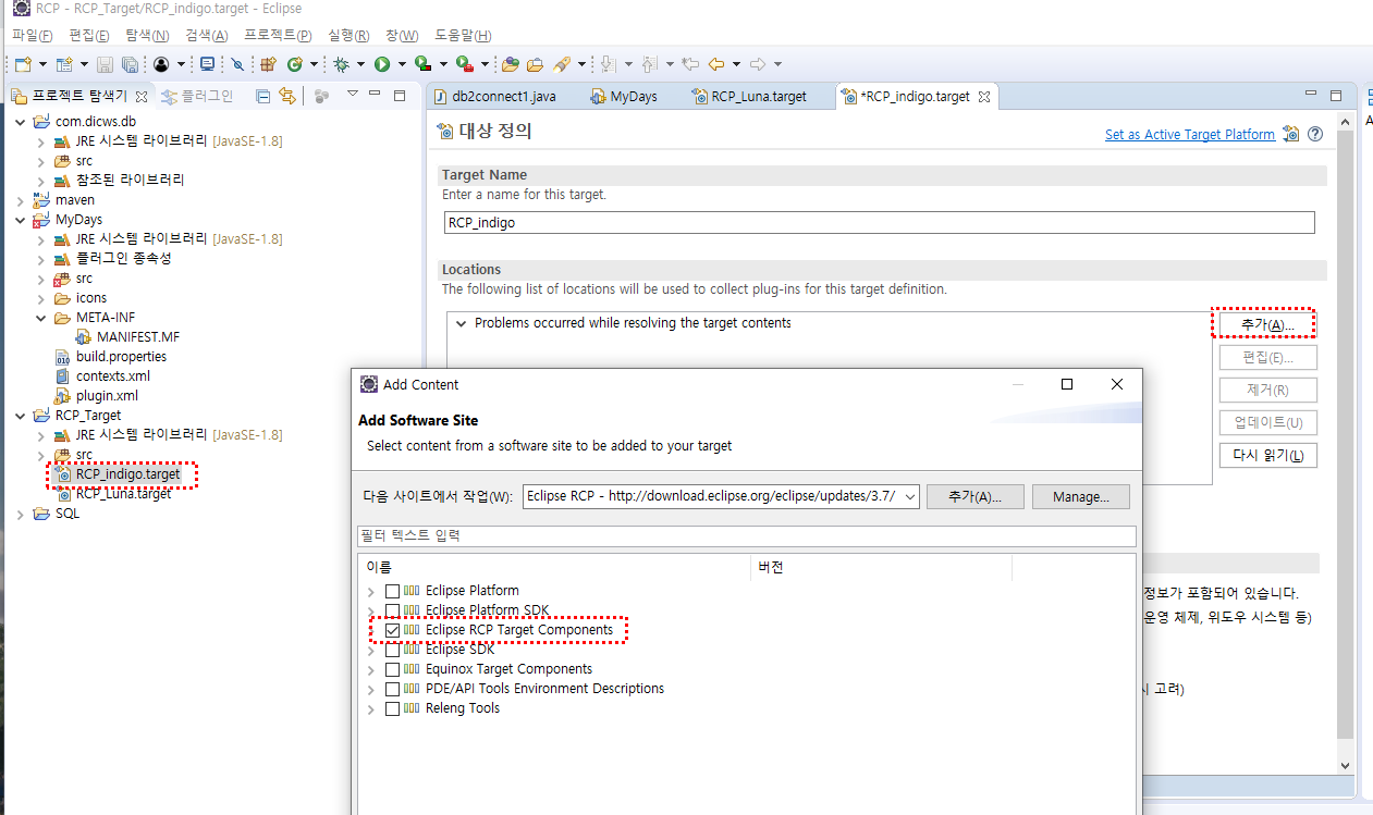 RCP환경설정에 앞서 이클립스는 2000년도부터 무수히 많은 버전을 만들어왔는데 문제는 버전별로 처리 가능한지 하기 위해 이중구성(IDE 환경과 RCP환경)