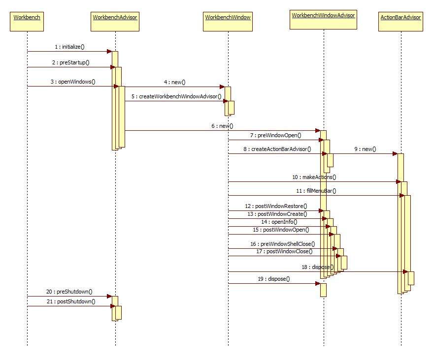 Workbench의 lifecycle에 대해 명시하고 있다. default perspective와 같은 중요한 파라미터들을 Workbench에 제공한다. 가장 중요한 점은 WorkbenchAdvisor의 메소드들은 오버라이드가 될 수 없다.