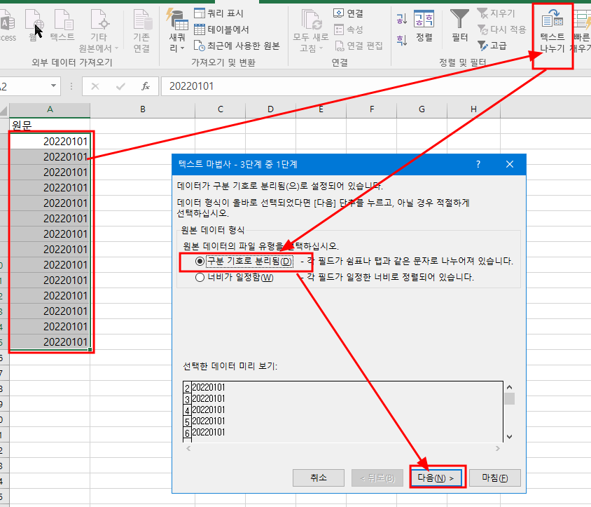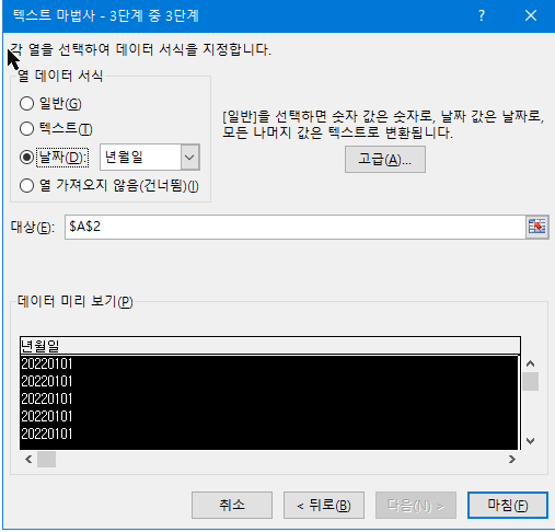 - 다음 후 텍스트 마법사 3단계중 3단계에서 -> 날짜를 선택하면 됨