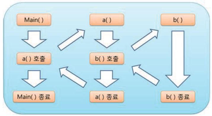 main() -> a호출 -> a실행 -> b호출 -> b실행 -> b종료-> a복귀 -> a종료 -> main복귀 -> main종료