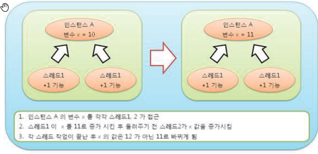 동시에 실행되는 스레드가 공유되는 인스턴스가 가지고 있는 변수에 동시에 접근하는 상황이 발생된는데 이상황이 잘못된 결과를 만들수 있다