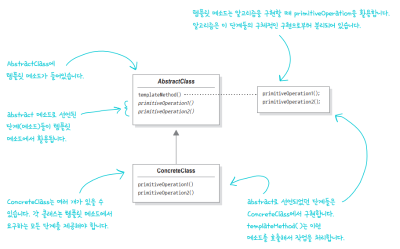 어떤 작업을 처리하는 일부분을 서브 클래스로 캡슐화해 전체 일을 수행하는 구조는 바꾸지 않으면서 특정 단계에서 수행하는 내역을 바꾸는 패턴이다.