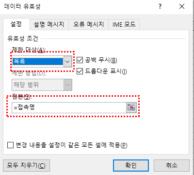 왼쪽에 콤보를 만들 셀을 선택하고 데이터 유효성 검사 선택